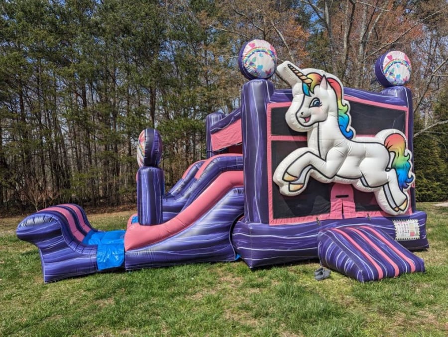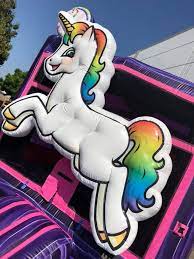 This unicorn bounce house rental will be her dream come true and make the ultimate statement at your unicorn birthday party! Have you been looking for a Unicorn Bounce House rental near me? Maybe all you have been able to find is a bounce house with a unicorn banner? That is okay... but you want better than okay for your special day. The beautiful pink and purple marbled colors are a perfect match to your party theme and the giant 3-D unicorn on the front of the bounce house welcomes all who want to come in and have fun! To add to the excitement there is also a climb and a slide that will keep the party moving all day long! This bounce house party rental screams unicorn in all of its amazing glory.